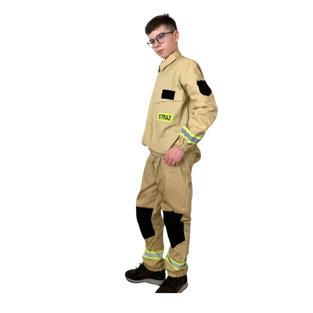 Ubranie koszarowe MDP piaskowe – trwały mundur dziecięcy dla Młodzieżowej Drużyny Pożarniczej, wykonany z 35% bawełny i 65% poliestru. Zestaw zawiera kurtkę z kieszeniami i spodnie z gumką, z nadrukiem „STRAŻ” i taśmami odblaskowymi. Dostępne w rozmiarach 98–176 cm.